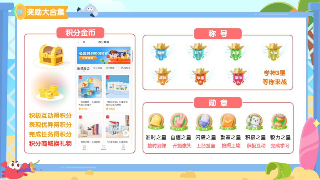为了鼓励孩子们在课堂上勇敢表达和互动,老师会在课堂中及时发放金币奖励,还有超有料的“超神时刻”,让孩子在音乐与欢呼声中做题,课堂答题数据持续记录,还可获得萌新、能手、高手、大神等称号,充分满足孩子心理!